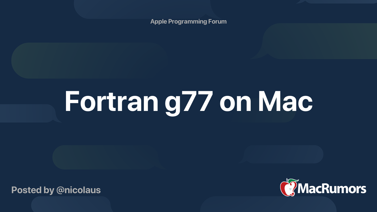 Because of the free-cost and high quality of the gnu copmpilers, a significant amount of software has been developed for and compiled with the g77 compiler. A tar file of the final realease of g77 compiled for OS X exists at High Performance Computing for Mac OS X. Download g77-intel-bin.tar.gz (Intel Mac only) or g77-bin.tar.gz (PowerPC only). I apologize, I forgot to give a reply to: all. Felipe - Forwarded message - From: Felipe Pimenta Date: Jan 28, 2008 12:38 PM Subject: Re: netcdfgroup g77, g95, netcdf-g95 on mac To: Ian Harris Hi Ian, Thanks for your message. Binaries: g77-bin.tar.gz (PowerPC only), g77-intel-bin.tar.gz (Intel Mac only), updated October 2006. Documentation: click here! F2C based Fortran: This is the oldest Fortran compiler available for OS X. Its been around since OS X was in a public beta state. Download this shell script: buildf2c, type chmod +x buildf2c and then sudo./buildf2c. The above f2exe command is just a batch file that invokes g77, the 'real' compilation command. The command: g77 -ffree-form prog.for -oprog.exe directs the compiler to compile the file prog.for and stores the output in the file prog.exe. The -ffree-form switch indicates free-form style (remove it if you are using the old style).